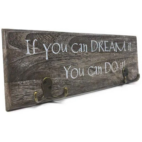 Appendiabiti da parete di forma rettangolare con due ganci doppi in bronzo. Decorato con scritta “if you can dream it you can do it” perfetta per dare un tocco di originalità agli arredamenti shabby chic. Dotato di ganci sul retro per facilitare il fissaggio