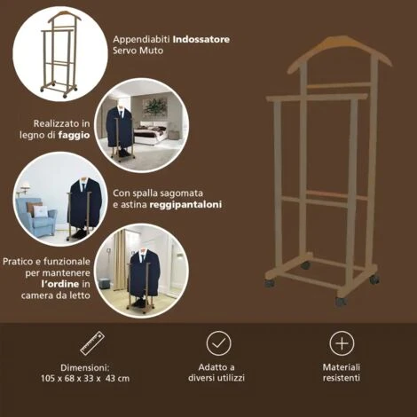 1 x Appendiabiti Indossatore Porta Abiti in legno Servo Muto Colore noce.