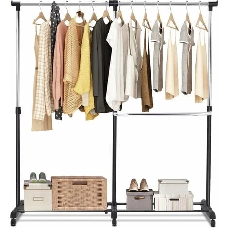 【Design a doppia asta】 L’appendiabiti doppia asta offre più spazio per ordinare e asciugare i vestiti. C’è anche un ripiano inferiore per ulteriore spazio di archiviazione. È semplice ma pratico appendiabiti e rende i tuoi vestiti più ordinati.