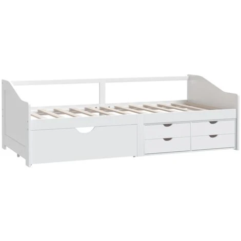 Il divano letto è realizzato in legno massello di pino, un materiale che lo rende solido e resistente. Le robuste doghe offrono anche il supporto e il comfort necessari. Sono inclusi 5 pratici cassetti per riporre vestiti, giocattoli o altro.