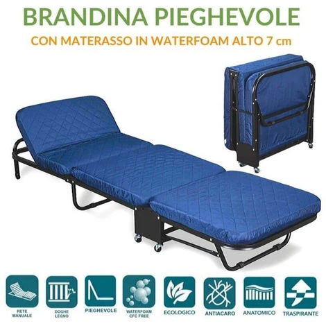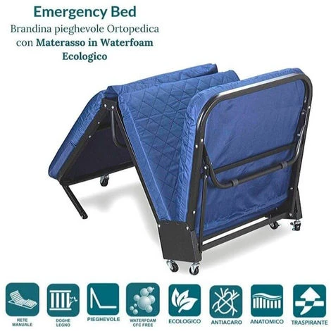 Kit Letto Singolo Pieghevole con Materasso in Waterfoam 65×190 alto 7 cm, MATERASSO Ortopedico con Rivestimento Traspirante, tessuto Anallergico e Antiacaro, Lastra interna in Water Foam ad alta resilienza, poliuretano in schiuma espansa ad acqua, per donare il giusto sostegno alla colonna vertebrale. Testata Regolabile in varie posizioni. Brandina adatto a pesi fino 130 kg – Modello EASY. Telaio portante in acciaio ad alta resistenza di nuova generazione, sagomato 40×36 e verniciato con polveri epossidiche. Rinforzata – garantisce una tenuta ancora più solida. Completa di 4 ruote avvitabili ANTIGRAFFIO alti 5 cm in nylon ad alta resistenza e viti di montaggio per il fissaggio – permettono un facile spostamento di quest’ultima su qualsiasi tipo di pavimento. Angoli antinfortunistici in nylon e fibra di vetro ad alta resistenza. Brandina con 3 Doghe Uniche Ammortizzate poste su supporti in acciaio e caratterizzata da uniformità di comportamento delle singole doghe. Le doghe in betulla di questa rete subiscono la piegatura a vapore, rendendole più elastiche, mentre la verniciatura, fatta con prodotti naturali, protegge il legno dagli agenti esterni. Inoltre sono dotate di pellicola protettiva la quale, insieme alle lavorazioni a fori e le scanalature, favoriscono la areazione. Letto Salva Spazio – Apribile – Reclinabile, ideale per Ospiti come Letto di Emergenza Estraibile, x camera, cameretta o campeggio, Compatibile con tutti i tipi di Materassi alti max 10 cm e Cuscini. Misure Ingombro Branda CHIUSA: una volta piegata è piccolissima, 73 cm in altezza // 33 cm in spessore // 65 cm in larghezza. Misure Ingombro Branda DISTESA: 65 cm Larghezza x 190 cm di Lunghezza x 20 cm Altezza Finita da terra al Bordo Superiore.