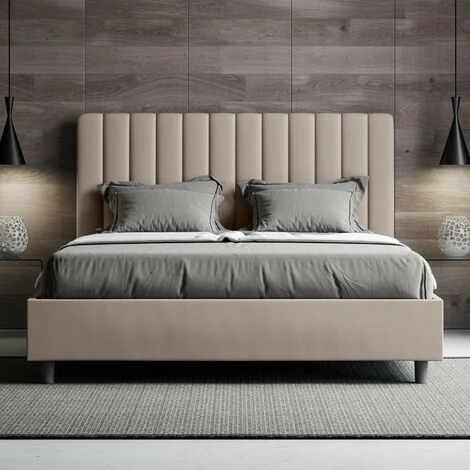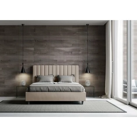 Letto matrimoniale modello Agueda con giroletto imbottito, rivestimento in similpelle. Per voi in continua contraddizione nello scegliere un prodotto d’effetto, ma non stravagante, il letto Agueda fa al caso vostro. Letto imbottito dalla testata essenziale che forma un piacevole effetto trapuntato dalle linee verticali simmetriche, perfettamente abbinabile a qualunque contesto di arredo moderno o classico che sia. Il materiale in similpelle conferisce alla stanza una maggior sensazione di accoglienza. È particolarmente adeguato ad ambienti molto luminosi, trattandosi di un materiale che non altera il suo colore persino dopo una lunga esposizione ai raggi solari. Letto fornito senza rete, predisposto per rete e materasso L.160 P.200