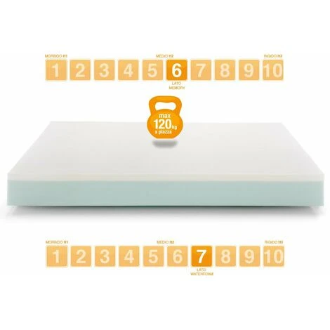 Grado di rigidità: Memory Foam 6/10 (lato bianco per tutto l’anno) – Waterfoam 7/10 (lato azzurro eventualmente per il periodo più caldo)