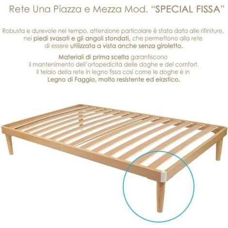 Rete Ortopedica modello Special Una Piazza e Mezza 120×200 cm Alta 52 cm Ortopedica Ergonomica Adatta a tutti i tipi di Letti e Materassi. Base Letto con 14 doghe in Legno Naturale di Faggio mis.68x8mm ad elevata resistenza. Sezione della struttura (Telaio) 70x25mm. Verniciata con prodotti naturali per proteggere il legno dagli agenti esterni. Le 14 Doghe piegate a vapore, conferiscono alla rete una maggiore flessibilità rispetto alle altre reti. 4 Gambe affusolate in legno massello di Faggio – Angoli antinfortunistici stondati in materiale ad alta resistenza. La Rete Ortopedica Special è completamente prodotta in Italia, a norma CEE; E’ caratterizzata dall’utilizzo di materiali atossici, privi di sostanze nocive, riciclabili. Confezionata e spedita all’interno di apposito cartone. Garanzia a norma di Legge.