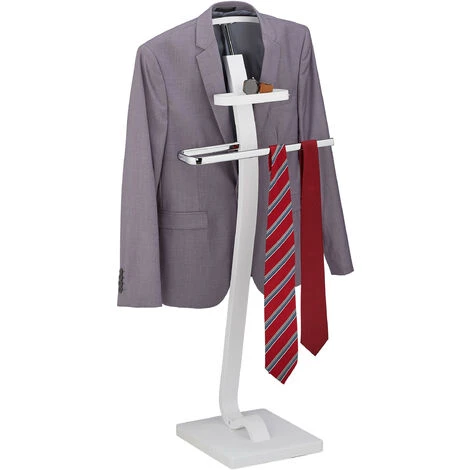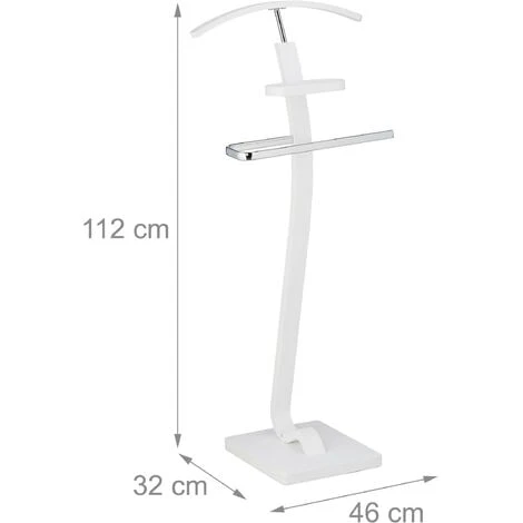 Con il servo muto da camera puoi riporre i tuoi abiti dicendo addio alle pieghe e stropicciature. L’appendiabiti bianco con dettagli argentati è ideale per i tuoi outfit di lavoro. Appendi la giacca o la camicia sulla gruccia e i pantaloni e la giacca sull’asta. Inoltre, l’appendiabiti è dotato di un piccolo ripiano per i tuoi accessori. Il maggiordomo è ideale in la camera da letto o nella cabina armadio.
