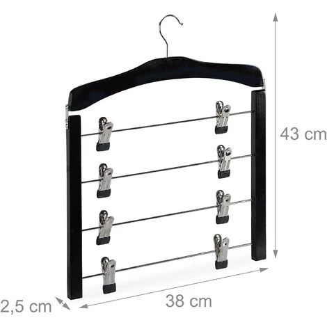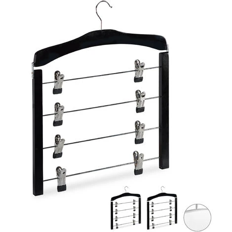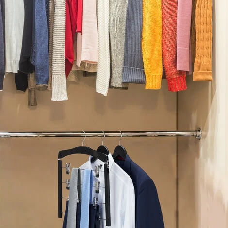 Non avete molto spazio nell’armadio, ma avete alcune gonne o pantaloni da conservare in maniera ordinata? Allora questo set da 3 grucce è proprio ciò che fa per voi. Ogni stampella dispone di 4 aste con 2 pinze ciascuna che si possono far scorrere o ruotare in base alle esigenze. Le pinze lavorate finemente hanno una presa stabile ed essendo gommate non lasciano alcuna traccia sui vostri capi. Grazie agli appendini per gonne con gancio girevole a 360° conserverete i vostri capi facilmente e senza sgualcirli.