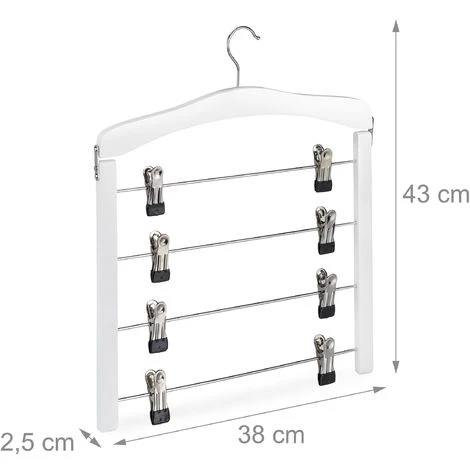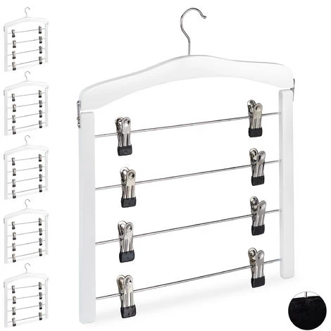 Non avete molto spazio nell’armadio, ma avete alcune gonne o pantaloni da conservare in maniera ordinata? Allora questo set da 6 grucce è proprio ciò che fa per voi. Ogni stampella dispone di 4 aste con 2 pinze ciascuna che si possono far scorrere o ruotare in base alle esigenze. Le pinze lavorate finemente hanno una presa stabile ed essendo gommate non lasciano alcuna traccia sui vostri capi. Grazie agli appendini per gonne con gancio girevole a 360° conserverete i vostri capi facilmente e senza sgualcirli.