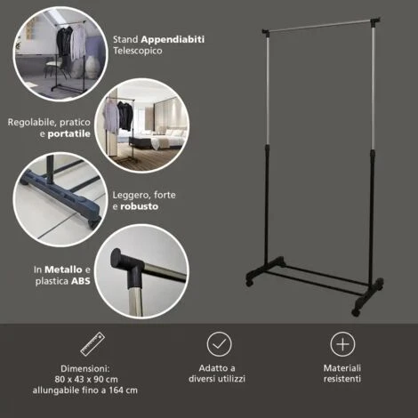 Questo Appendiabiti è leggero , forte e robusto ed ha una scorrevolezza a 360 ° Ruote piroettanti . L’appendiabiti può essere utilizzato anche senza le ruote.