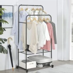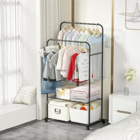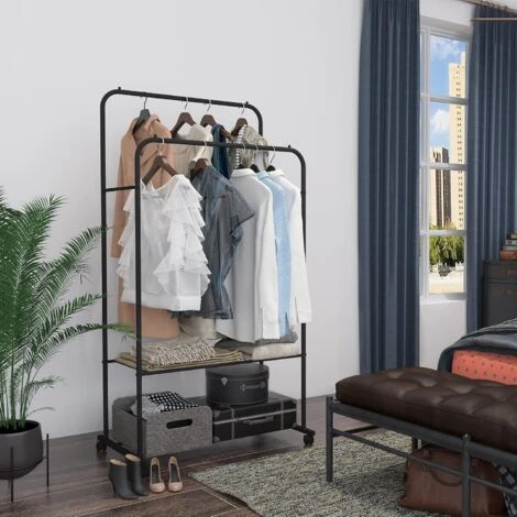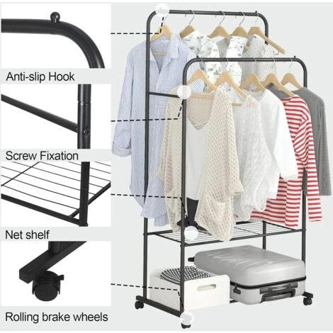 - ALTA QUALITÀ: Il materiale del portabiti da camera con ruote è adottato ferro antiruggine robusto e stabile, i design a doppi gambi durevoli ed ispessiti può contenere più vestiti, le barre alte ebasse sono adatte per vestiti di diverse lunghezze, non facile da deformare e ha una vita maggiore, qualità garantita.