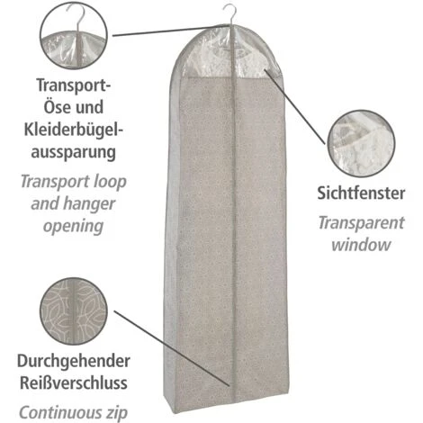 Dotata di una chiusura lampo continua, la custodia per indumenti può essere aperta e chiusa comodamente. Una finestrella trasparente permette di prendere visione del contenuto anche quando il sacco è chiuso. Particolarmente pratico: l ‘asola per il trasporto e la fessura per la gruccia appendiabiti!